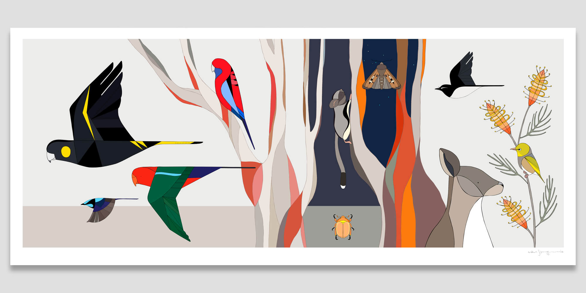 Featuring: Yellow-tailed Black-Cockatoo, Superb fairy-wren, Australian King Parrot, Crimson Rosella, Sugar Glider, Aurora Christmas Beetle, Bogong Moth, Eastern Grey Kangaroo, Willie Wagtail and Silvereye.